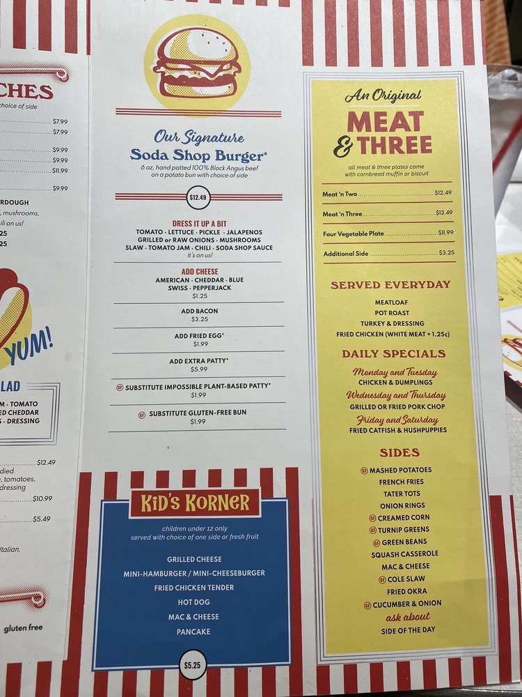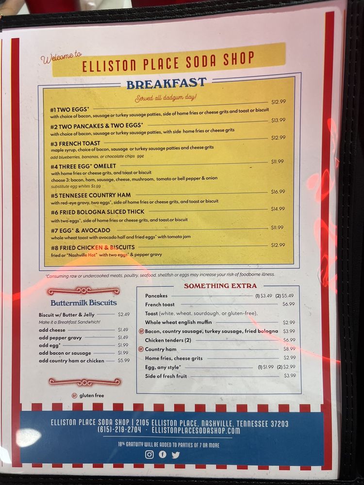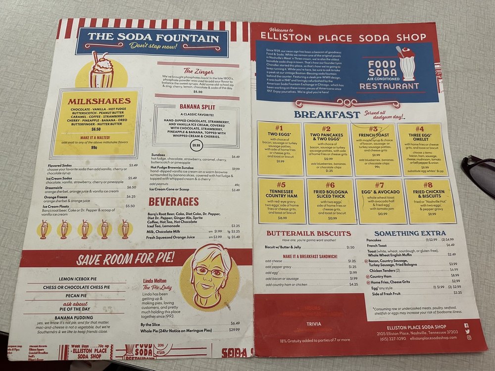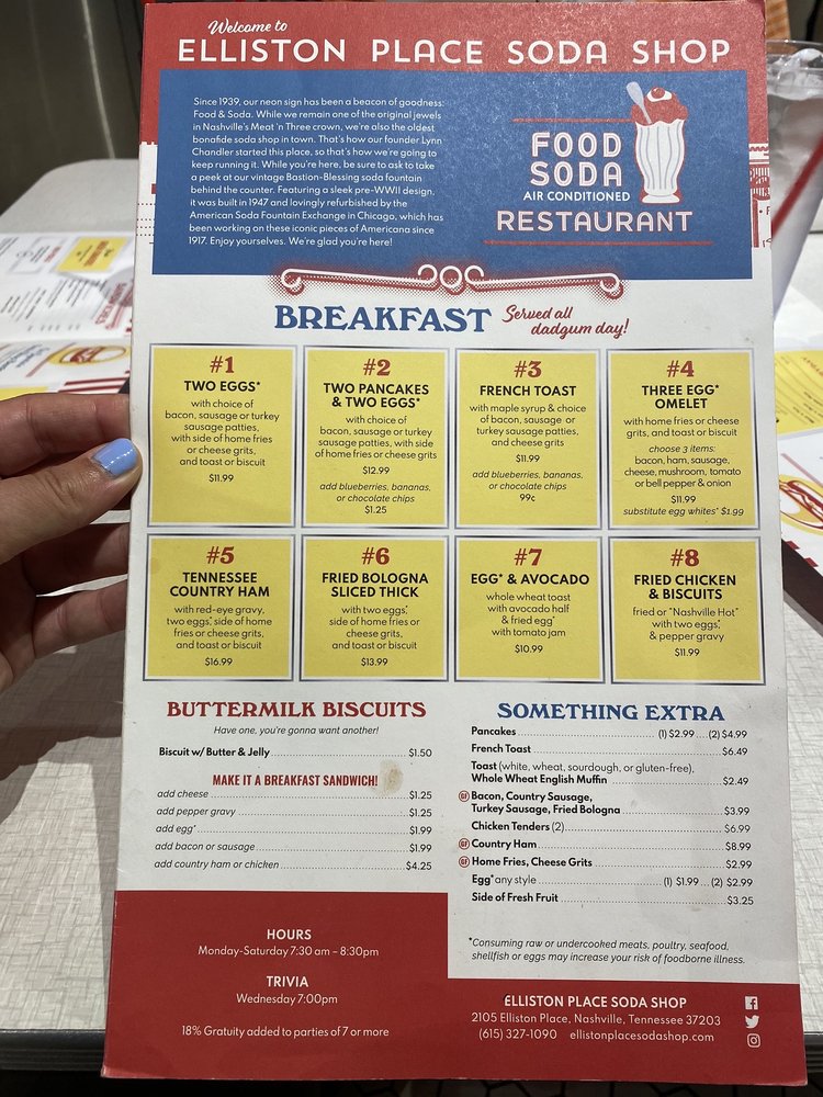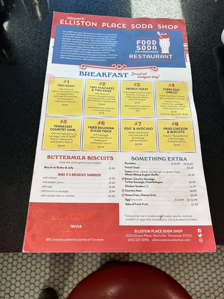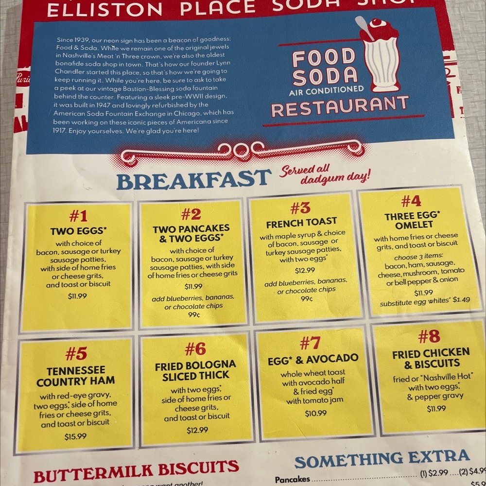 Elliston Place Soda Shop, a charming American Breakfast & Brunch spot in Nashville, offers a diverse menu with Vegan and Vegetarian options. The 50's ambiance adds a nostalgic touch to the dining experience, with friendly servers enhancing the charm. Specialties include the decadent crème brûlée French toast, buttery biscuits, and comforting fried chicken. Customers rave about the old-fashioned jukebox and the famous SkyHigh meringue pie made by Miss Linda. Whether you're craving a classic diner meal like a Chicken Salad Sandwich or a more indulgent treat like a Banana Split, Elliston Place Soda Shop has something for everyone. Don't miss out on their hand-spun malt shakes and friendly service. This gem in Nashville promises a delightful dining experience filled with comfort food and retro vibes.